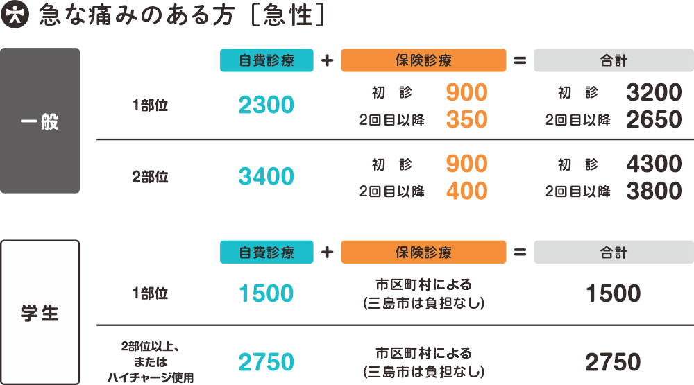 - 「保険診療」は、原因が明確な急性のケガ(捻挫・打撲・肉離れなど)に対して適用されます。 そのため、保険で行えるのは患部に対する施術が中心となります。