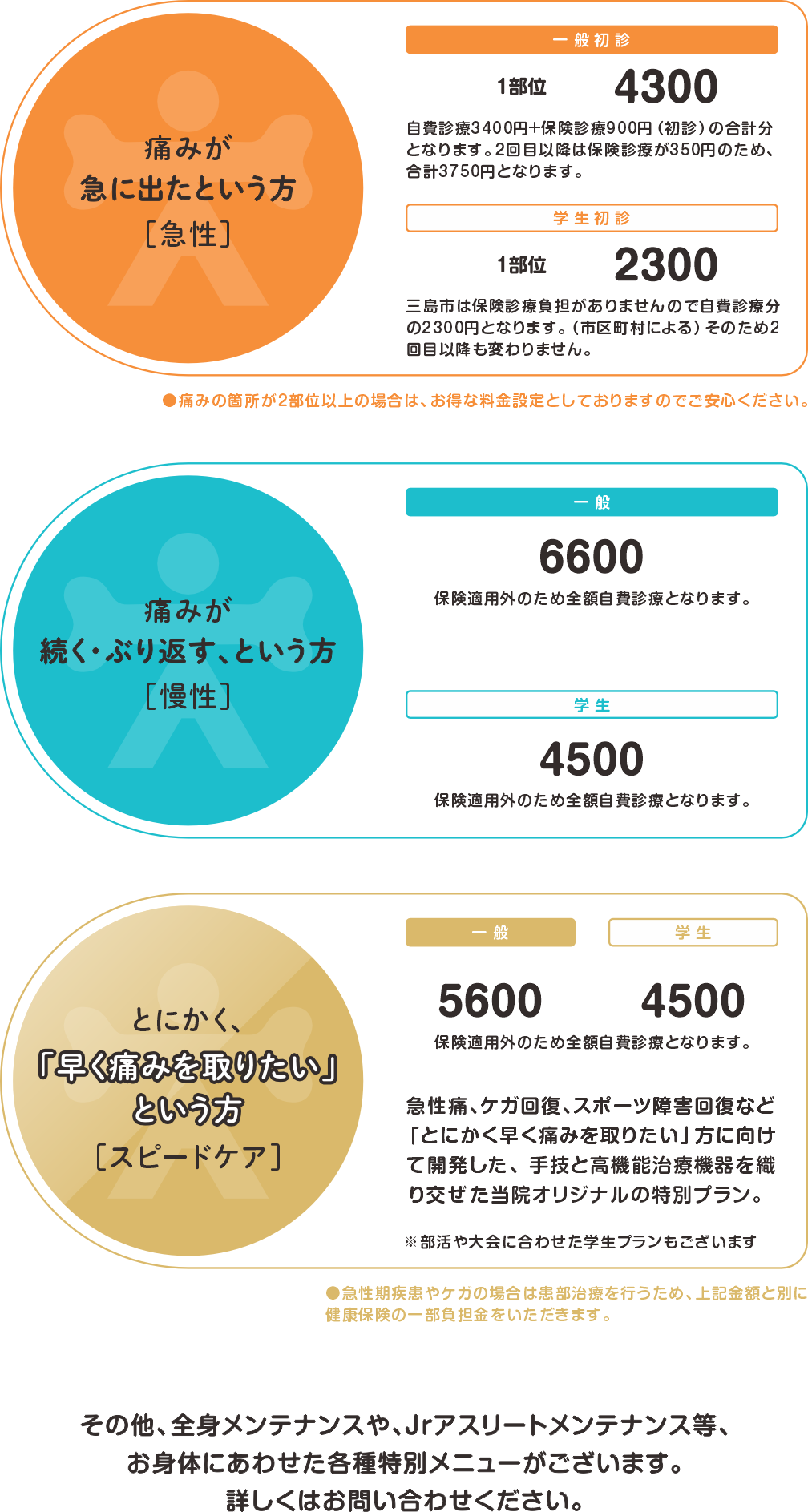 - 症状やご予算に応じて最適な施術プランをご提案いたします。ご不明な点はお気軽にご相談ください。