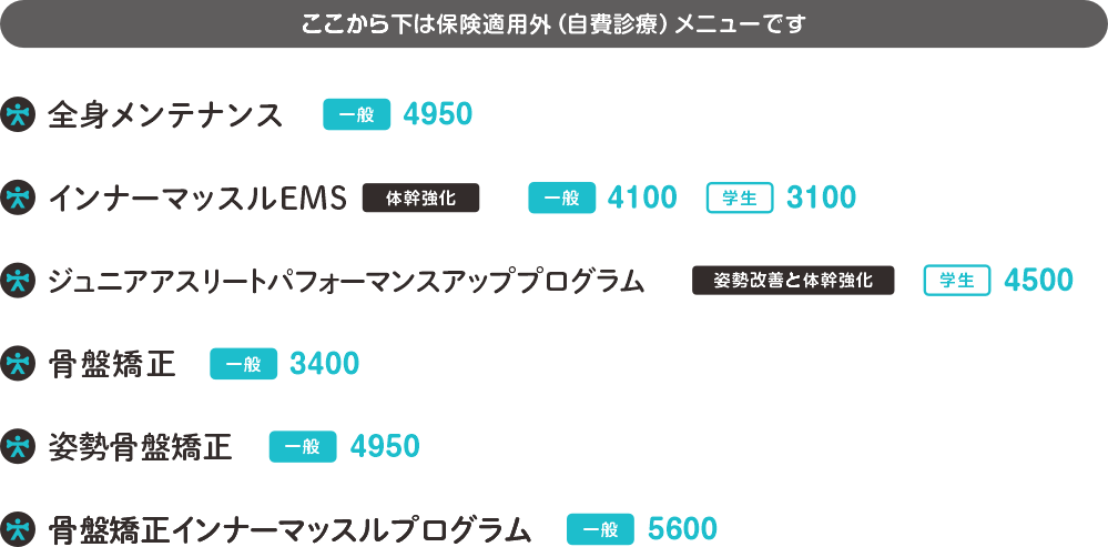 - IBUKI接骨院では、痛みの早期改善と再発予防を目的に、保険診療に加えて自費施術を併用しています。患部だけでなく、痛みの原因となる筋肉・関節・神経・姿勢バランスまで総合的にアプローチします。
