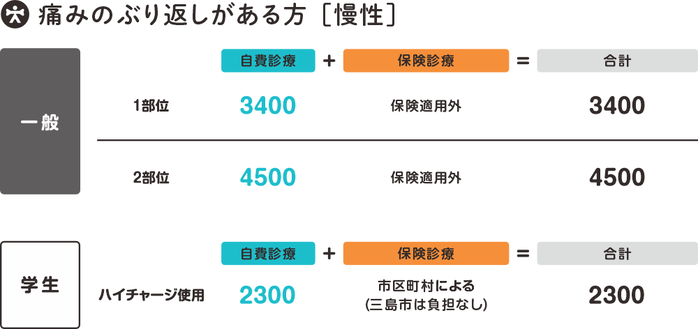 - 当院で使用しているハイチャージ・アキュスコープ・エレサスなどの治療機器は、より高い効果を得るための保険適用外の自費施術となります。